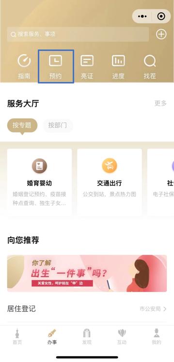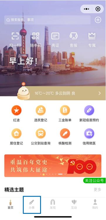 打开随申办app或者微信、支付宝随申办小程序,点击页面左下角“办事”