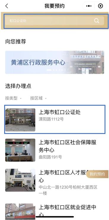 在页面最上方输入“虹口公证处”,页面跳转后点击选择“上海市虹口公证处”