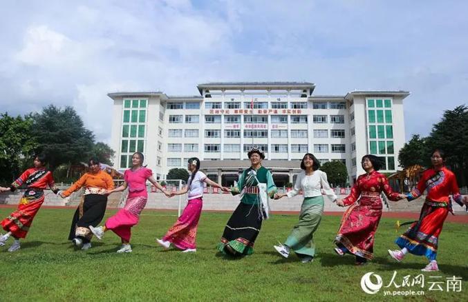在大理州民族中学,各族学生同跳一支舞。人民网 李发兴摄