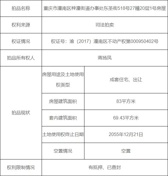 拍卖标的物:重庆市潼南区梓潼街道办事处东圣街518号27幢20层1号房屋