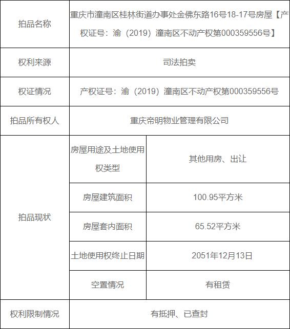 拍卖标的物:重庆市潼南区桂林街道办事处金佛东路16号18-17号房屋【产权证号:渝(2019)潼南区不动产权第000359556号】