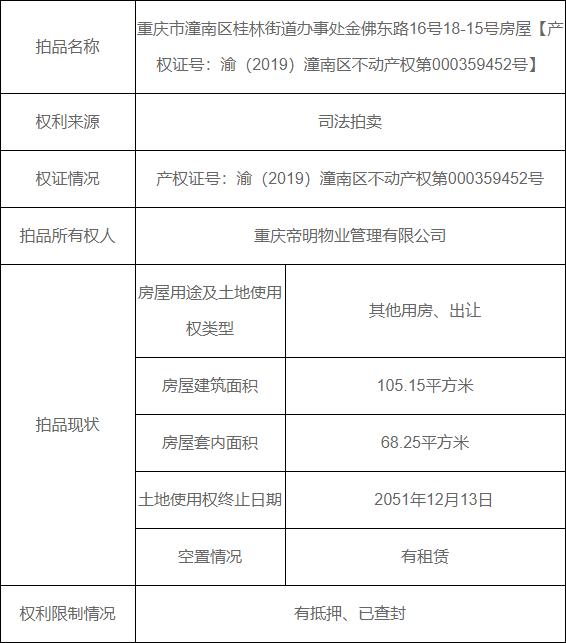 拍卖标的物:重庆市潼南区桂林街道办事处金佛东路16号18-15号房屋【产权证号:渝(2019)潼南区不动产权第000359452号】