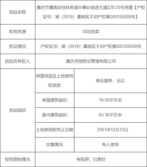 拍卖标的物:重庆市潼南区桂林街道办事处奋进大道228-25号房屋【产权证号:渝(2019)潼南区不动产权第000359288号】