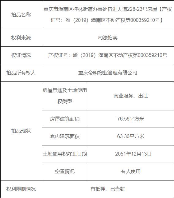 拍卖标的物:重庆市潼南区桂林街道办事处奋进大道228-23号房屋【产权证号:渝(2019)潼南区不动产权第000359210号】