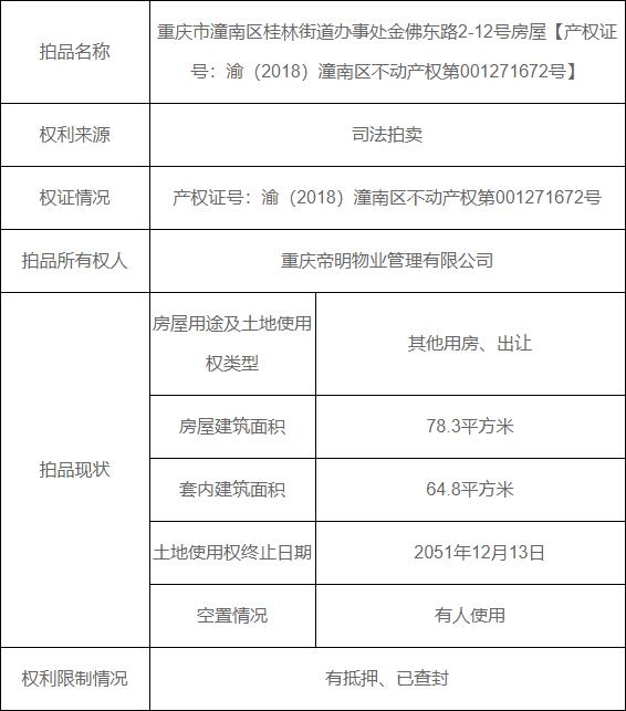 拍卖标的物:重庆市潼南区桂林街道办事处金佛东路2-12号房屋【产权证号:渝(2018)潼南区不动产权第001271672号】