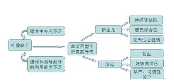 同型半胱氨酸在人体有两种代谢途径,一种是再甲基化途径,即同型半胱氨酸在叶酸和维生素B12的辅助作用下生成蛋氨酸;另一种叫转硫途径,即在维生素B6依赖酶的支持下,同型半胱氨酸形成半胱氨酸。当孕妈妈体内叶酸、B族维生素或者某些代谢酶缺乏时,就会发生同型半胱氨酸升高。