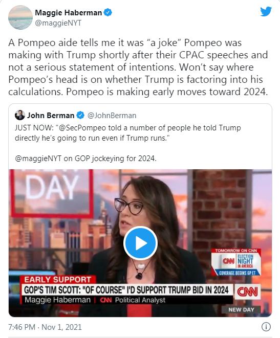 《纽约时报》的白宫记者、CNN的政治分析员麦吉·哈伯曼11月1日在节目中透露,蓬佩奥跟一些人说,他已经告诉特朗普他会参加2024年总统竞选,即使特朗普也会参与竞选。