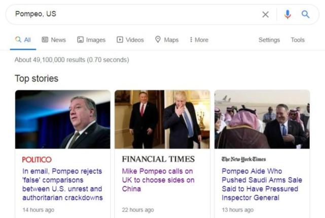 有人曾做过统计,如果在搜索引擎中输入“蓬佩奥、美国”,搜索结果为4.41千万条,而输入“蓬佩奥、美国、中国”,搜索结果为3.4千万条。