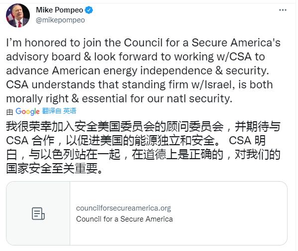 日前,蓬佩奥还宣布他将加入安全美国委员会(The Council for a Secure America),这个号称以保障美国能源安全为宗旨的智库,其核心是捍卫《亚伯拉罕协议》的理念和加强与以色列的战略联盟。