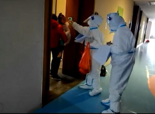 凌晨四五点,穿着厚重防护服的葛仙村工作人员,一间一间轻声敲开隔离者房门,一边说着抱歉,一边送上药物、棉服和生活物资。