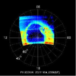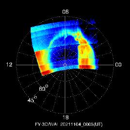 风云三号D星搭载的广角极光成像仪,观测到此次磁暴期间的北极光图像,受地磁扰动的影响,发生极光区域的亮度和范围较平常都有明显的增加,其内部也产生了较为复杂的精细结构。