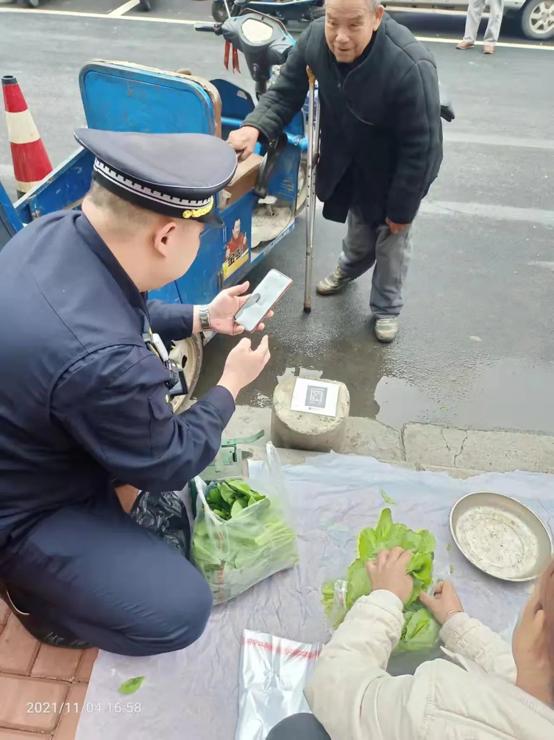 看到执法人员上前劝离,两名老人一边小声解释,一边收拾地上的青菜。