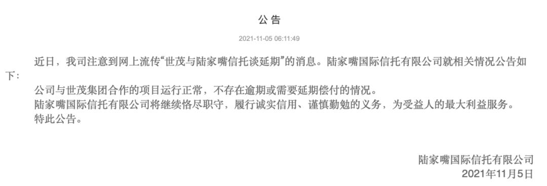 陆家嘴信托也在11月5日下午公告称,公司与世茂集团合作的项目运行正常,不存在逾期或需要延期偿付的情况。陆家嘴国际信托将继续恪尽职守,履行诚实信用、谨慎勤勉的义务,为受益人的最大利益服务。