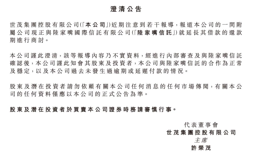 针对世茂旗下公司现正与陆家嘴信托就延长其借款的还款期进行商讨这一消息,世茂集团当日在其投资者关系公众号上澄清表示,经内部人士摸排以及与陆家嘴信托确认,目前世茂集团与陆家嘴信托合作正常,过往从未有过逾期或面临延期偿付事项。