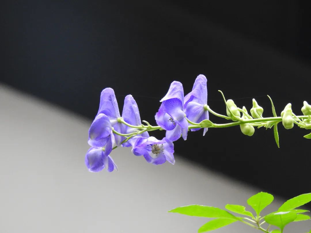 乌头 Aconitum carmichaelii,毛茛科乌头属多年生草本可观赏植物,可药用,上海植物园草药园中有栽培。《植物名实图考》中有形象生动描述:“其花色碧,殊娇纤,名鸳鸯菊,花镜谓之双鸾菊,朵头如比邱帽,帽拆内露双鸾并首,形似无二,外分二翼一尾”。