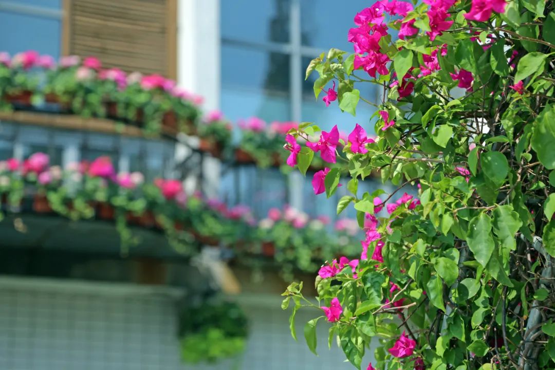 三角梅 Bougainvillea cv.,紫茉莉科叶子花属灌木,海南省的省花。喜温暖湿润气候,不耐寒,喜充足光照。叶片椭圆形或卵形,基部圆形,有柄,可做药用,但其茎有毒可致腹泻。花序腋生或顶生;苞片椭圆状卵形,基部圆形至心形,色彩鲜艳。上海植物园二号门及植物大楼正门广场均有展示。