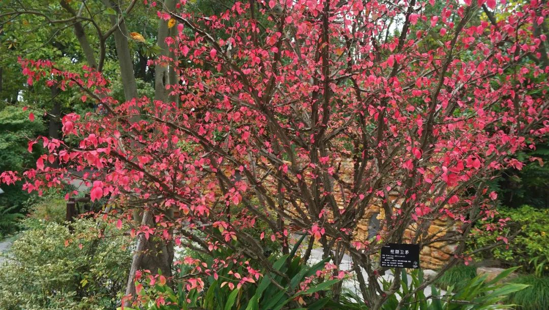 栓翅卫矛 Euonymus phellomanus,卫矛科卫矛属灌木,可观花、观果、观枝,树姿优美、形态独特。入秋后,秋叶一片火红,是典型的秋色叶类,近倒心形的蒴果粉红色,开裂后,似花朵盛开,非常美丽。