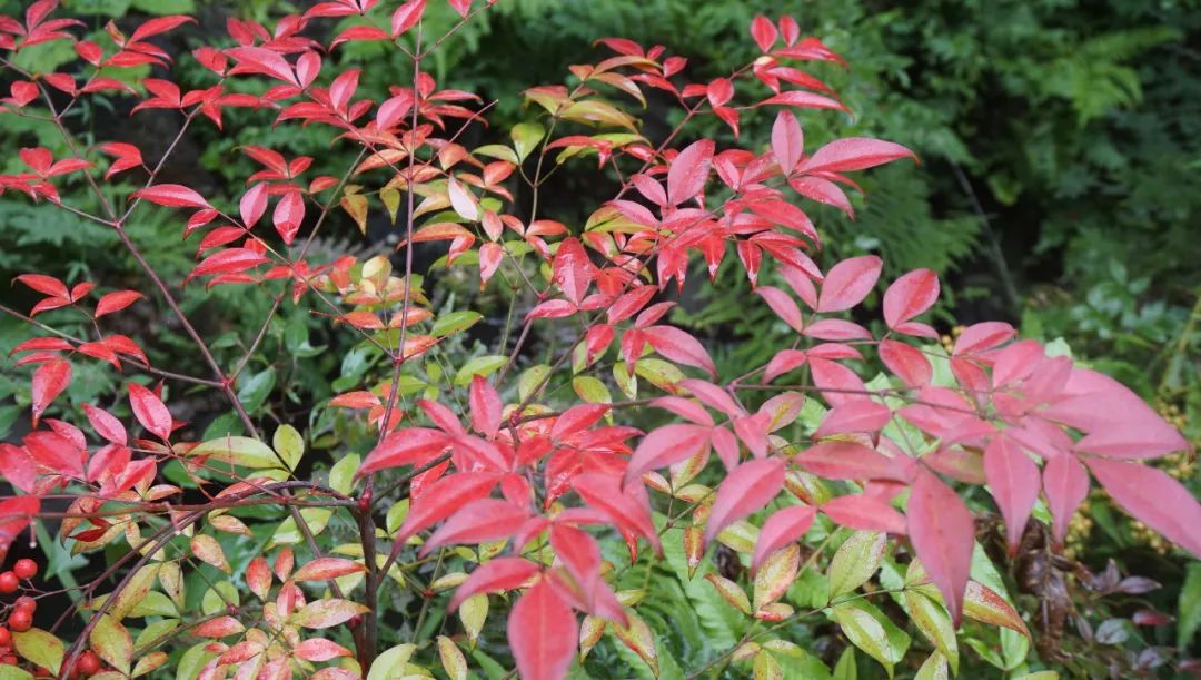 南天竹 Nandina domestica,小檗科南天竹属常绿灌木,又称天竹、红杷子、天烛子、红枸子等,分布于华东、华中、华南、西南等地。上海植物园内多处栽培,现正值果期,鲜红似火。小檗科的植物多含小檗碱等有毒物质,切勿食用。