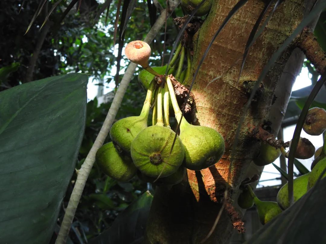 大果榕 Ficus auriculata,桑科榕属乔木,耐寒耐旱,,是优良的庭院绿化观赏植物。其枝叶可作蔬菜,果实可作水果或家畜饲料,果实晒干后可药用。看到它很快联想起无花果,确实它们是亲戚,而且有着共同的奇特特征:隐头花序。所以无花果代表的榕属并非“无花”,而是“隐花”。花隐藏在肉质壶形花序托内壁,也就是藏在果子的内部,为它传粉的榕小蜂要从果实顶端的小孔钻进去才行。上海植物园展览温室(一)有栽培。