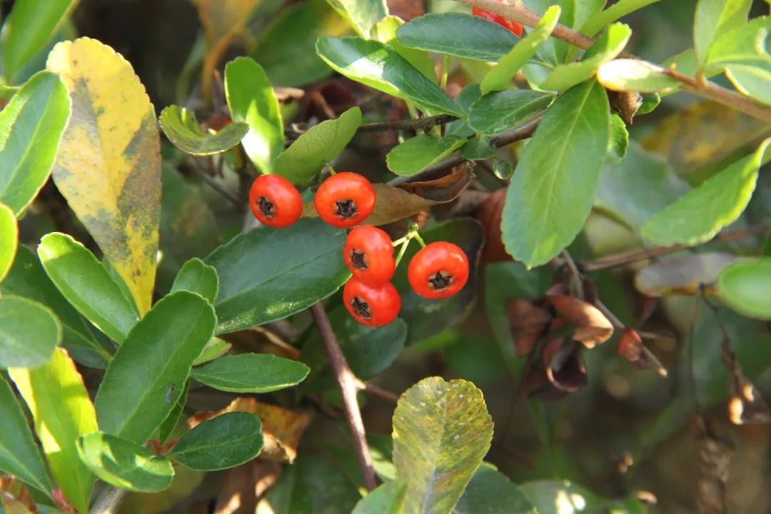 火棘 Pyracantha fortuneana,蔷薇科火棘属常绿灌木,别称火把果、红子刺、吉祥果,分布于中国黄河以南及广大西南地区。上海植物园多处栽培,现正值果期,古称“救军粮”。
