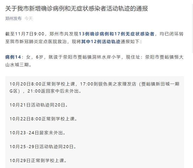 11月7日,据“郑州发布”,截至11月7日9:00,郑州市共发现13例确诊病例和17例无症状感染者。