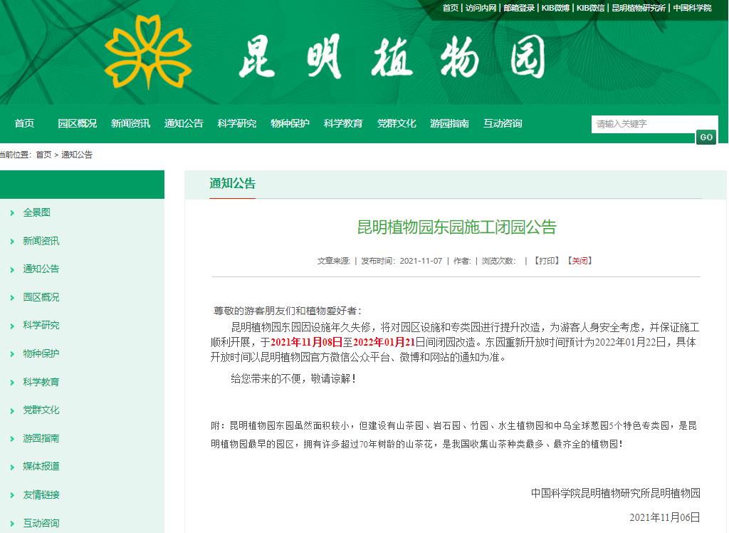 《昆明植物园东园施工闭园公告》