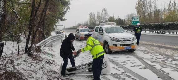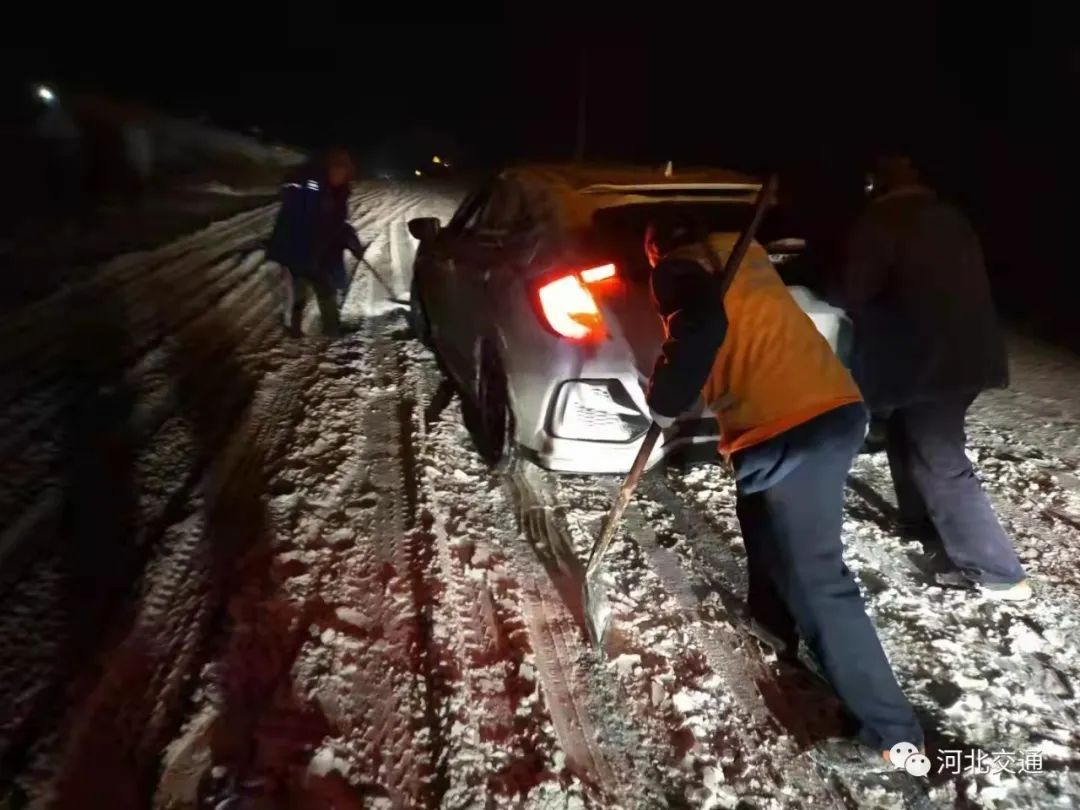 一线交通人对滞留车辆进行应急救援,为滞留人员送去热水和爱心餐食,用责任和担当为广大人民群众的安全出行保驾护航。