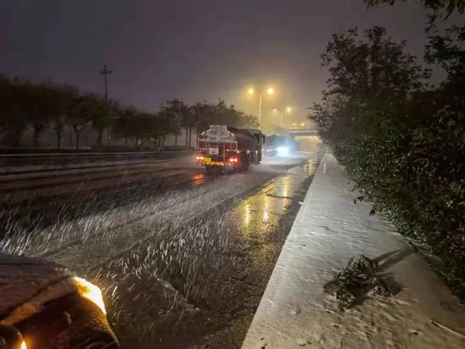 11月7日,济南市交通运输部门发布恶劣天气道路交通运输橙色预警,及时调度各高速公路运营企业,通过监控中心了解高速路况,及时撒布融雪剂,利用收费站入口与主线可变情报板、隧道内发布信息,提醒驾驶员小心驾驶,安全出行。
