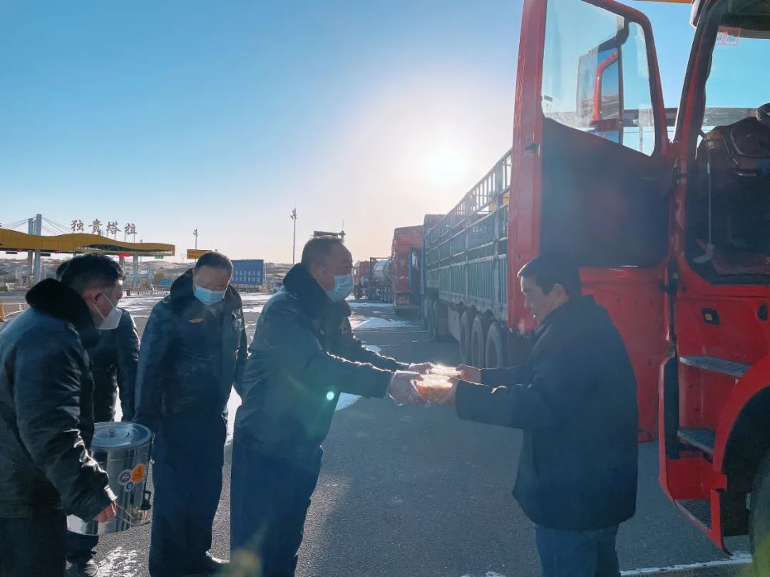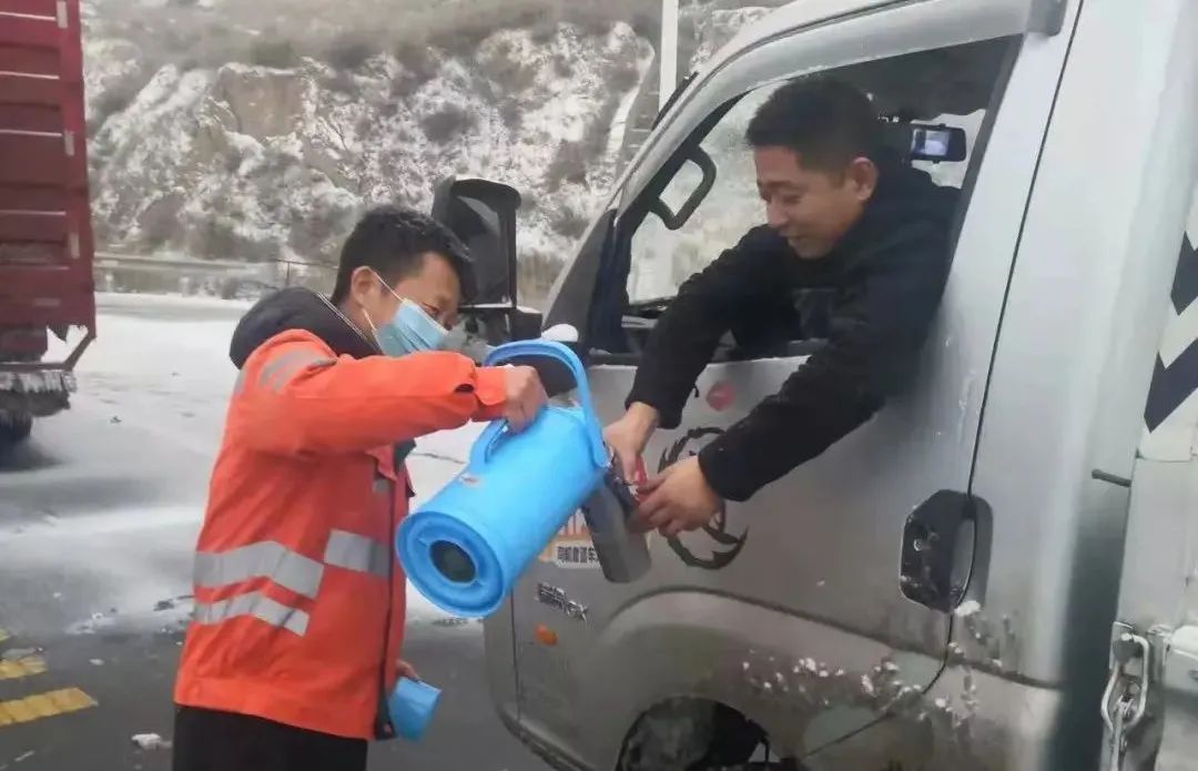 恒山隧道管理站工作人员在隧道管控期间为滞留司机送去热水。