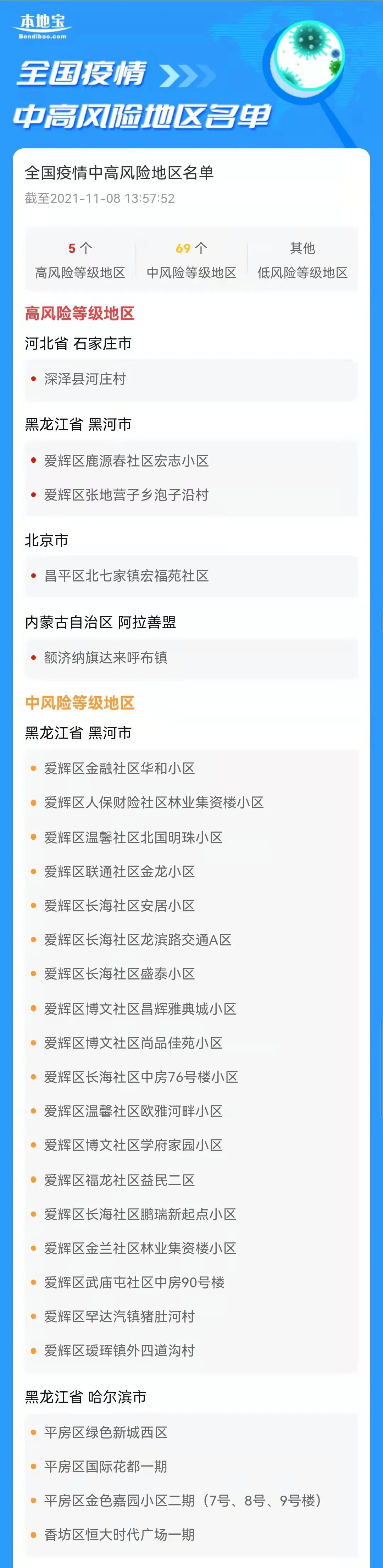 11月7日0—24时,31个省(自治区、直辖市)和新疆生产建设兵团报告新增本土确诊病例65例、本土无症状感染者34例。目前已有甘肃、内蒙古、陕西、青海、四川、湖北、湖南、贵州、黑龙江、江西、宁夏、河北、北京、云南、山东、重庆、江苏、河南、浙江等多个省份报告阳性病例。截至11月8日13时,我国有5个高风险地区和69个中风险地区。