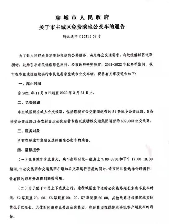 本次免费范围包括51条城乡公交线路、5条扶贫公交线路、2条农村客运公交运营专线,均全部实行免费乘车。去年冬季,聊城也实施过公交免费政策,时间同样截止到次年3月31日。