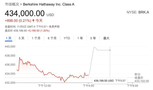 上周五收盘,伯克希尔股价报434000美元,年初至今上涨了26%。