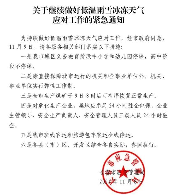 为持续做好低温雨雪冰冻天气应对工作,经长春市政府同意,11月9日,请各级各相关部门落实以下措施: