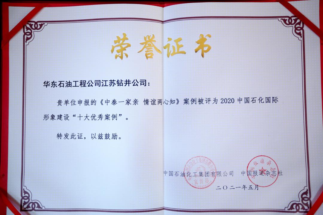 近日,2020中国石化海外形象建设案例征集评选结果揭晓,华东工程江苏钻井公司申报的《中泰一家亲 情谊两心知》案例被评为2020中国石化国际形象建设“十大优秀案例”。