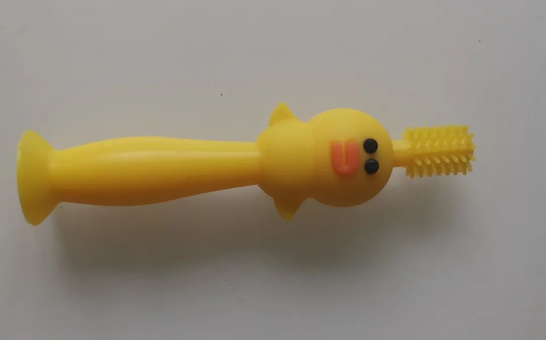 我们家用的是这款小黄鸭硅胶牙刷,卡通图案孩子比较好接受,但是因为硅胶刷毛,很难清洁干净牙缝和龈沟。