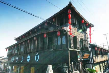 “第一楼书场”位于新场大街424号,洪桥港畔,初建于清同治十三年(1874),时为小瓦顶平房一栋。20世纪20年代初翻建成砖木结构的三层楼房,占地面积266.28平方米,建筑面积648.39平方米,四坡顶,西侧为歇山顶,东侧则为硬山观音兜,二、三层连排玻璃窗,五架梁。因其高度时为镇上第一,故俗称“第一楼”。