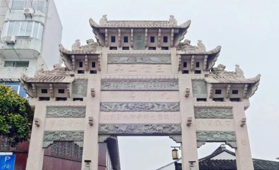 “三世二品坊”牌楼为明代太常寺卿朱国盛所建,为庆贺其与其祖朱镗、其父朱泗三代皆封赠二品官,故名“三世二品”坊。现牌楼为2006年重建,牌楼高11.3米,宽10.3米,总重量达150吨。