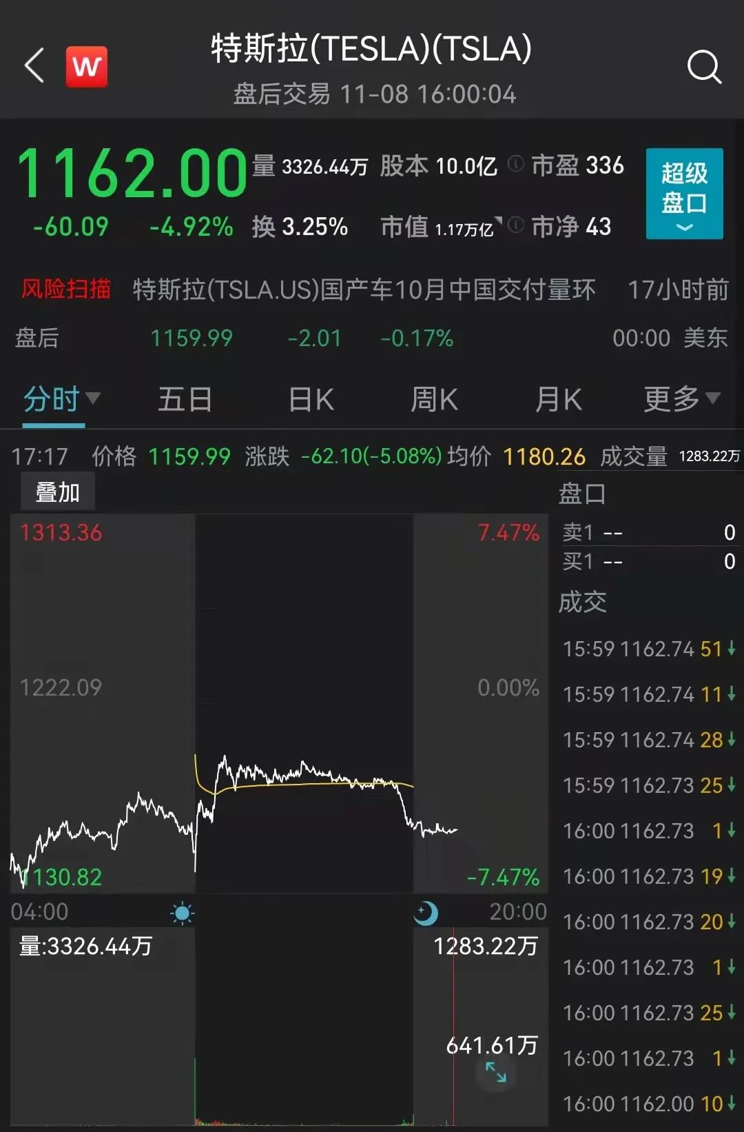 截至11月8日收盘,特斯拉股价报1162美元,下跌4.92%,总市值1.17万亿美元。
