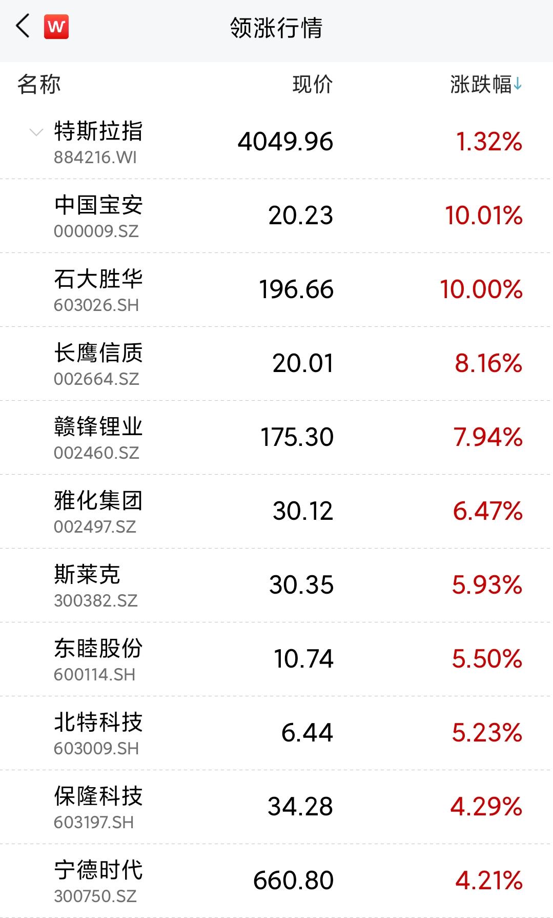 11月8日,Wind特斯拉指数上涨1.32%,报4049.96点,再创历史新高。板块内个股中国宝安、石大胜华涨停,长鹰信质、赣锋锂业、雅化集团、斯莱克等领涨。