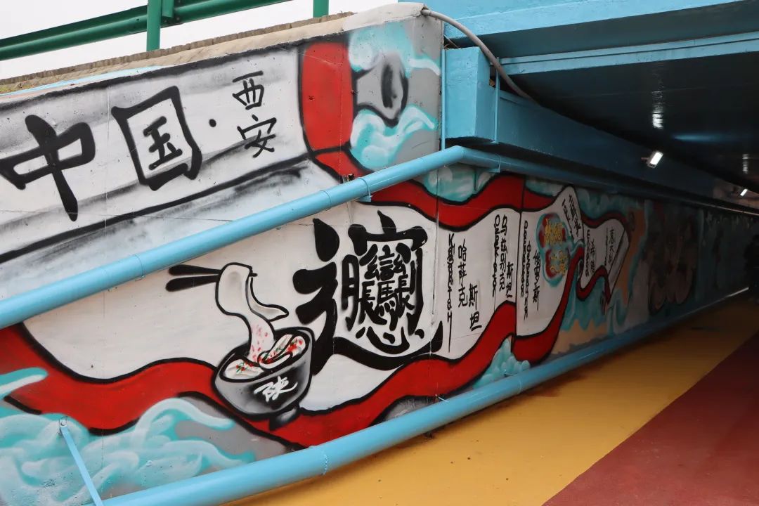 为了将长安特色与丝路风情融合呈现,高桥服务区规划建设以“丝路市集”为主题,集休闲、购物于一体的主题餐饮文创休闲街区。街区用新潮涂鸦的方式展现丝绸之路的文化故事、名胜古迹等元素,同时引入绘画、书法等文化元素,体现丝路文化主题,在街区内点上一杯咖啡,咥一碗地道的陕西大碗宽面,感受中西文化的奇妙碰撞。