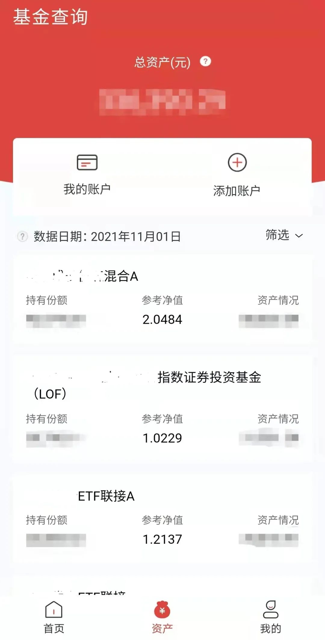 用账户登录进入基金查询,可以显示该账户下的总资产金额,并且详细列出了持仓基金明细。