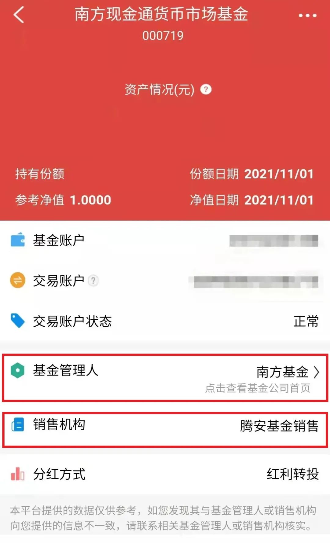 点击进入某只持仓基金页面,可以查询持仓的该只基金持有份额、资产情况,并且显示该只基金的基金管理人,投资者是通过哪个销售机构进行购买以及当前设置的分红方式。