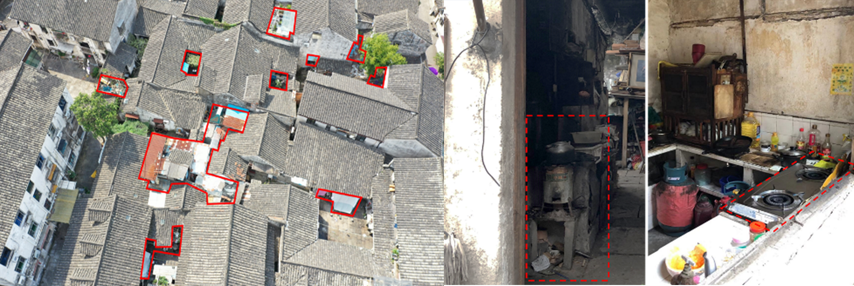 城内历史建筑多为木构筑元素,年代久远,易燃性高,火灾隐患较大。古城内有众多保留完整的特色台门建筑,不仅屋面山墙连片,在台门建筑空间内的居民生活同样也是“走进台门户邻户里,一弄到底六七人家”,极易造成火灾蔓延。狭小的空间造成日常生活场所的重合,使用功能混杂;院落、天井内违建现象普遍,屋面雨棚连片;生活杂物堆积,走廊过道空间狭窄;内部线路老化、线网交织。