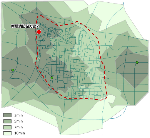 在具体消防站的选址问题上,针对实地摸底排查获取的两处可落地空间,对备选方案进行服务范围模拟分析比较。规划对传统基于距离阈值的消防能力评价方法进行优化,使用网络分析法,考虑古城交通网络与动态状况,分析评估了不同方案消防站3、 5、 7、 10分钟出警覆盖情况与责任分区差异。