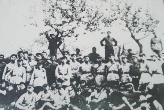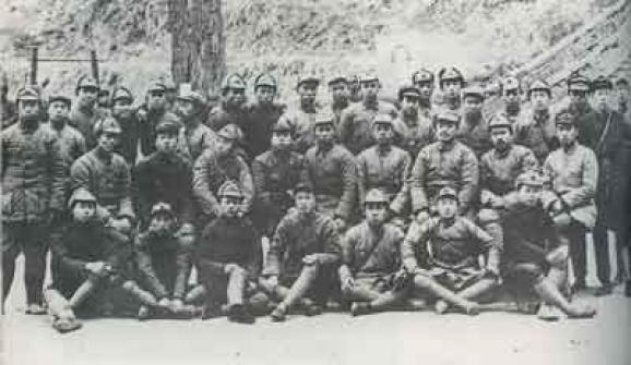 到达陕北的红二方面军一部合影。中排右三为贺龙,右二为任弼时,左一为王树声。照片中红军干部大都戴相同的棉帽,说明此时红军服装式样基本统一。