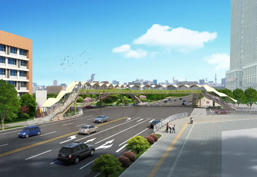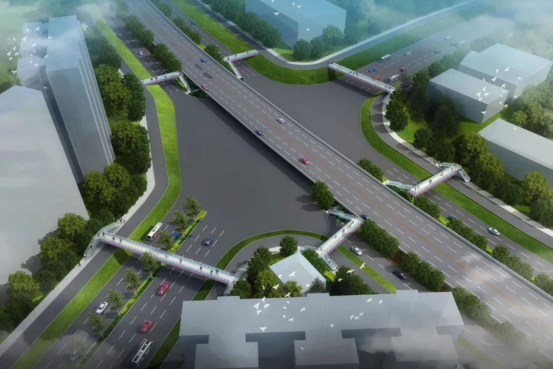 该项目位于锦绣路与三一大道交叉口处,桥梁总长度约170米。该项目目前三一大道互通段、锦绣路段、汽配城路段已完成天桥梯道吊装施工,预计今年12月完工交付。本项目周边区域分布众多的建筑物及居民小区,根据开元互通区域实际状况,在本互通区域内四个方向分别新建人行天桥,其中东、西方向的人行天桥跨越三一大道两侧的辅道,北边人行天桥跨越锦绣路,南边人行天桥跨越汽配城路,建成后将有效缓解该互通区域交通压力,保障居民出行安全。