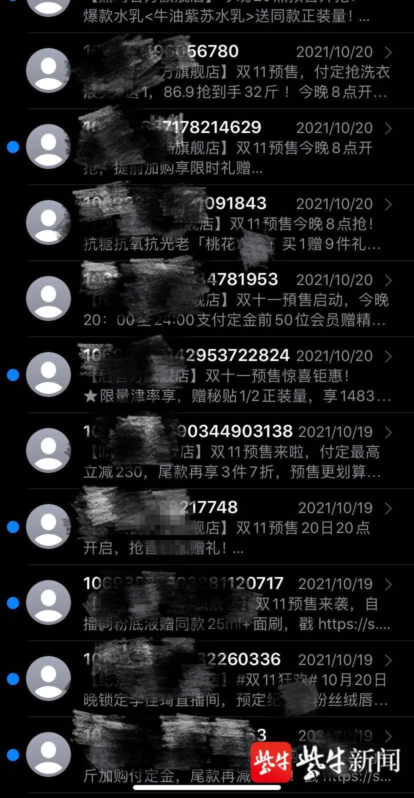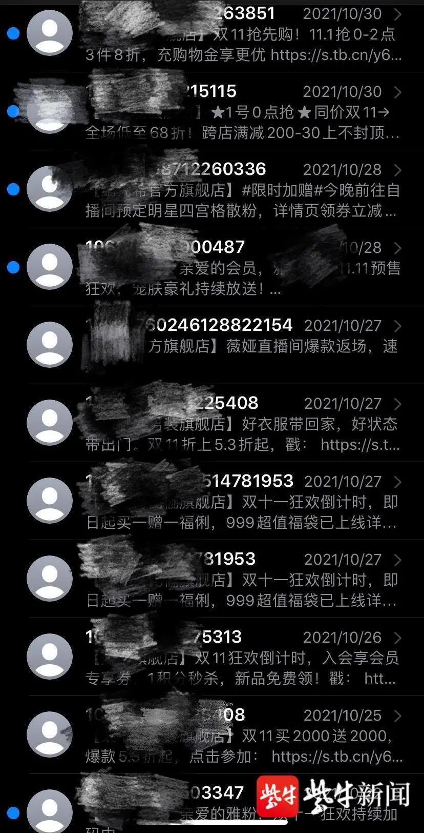 “10月19日-20日,收到店铺发送的短信就有20多条。”李女士向记者展示自己短信记录,基本都被双十一短信刷屏。而发送短信的店铺,都是李女士下过单的店铺。“到目前为止,这样的短信超过60条,经常把重要信息给淹没下去了。”而更令她头疼的是,这些短信发送时间并不固定,夜里12点也经常收到短信提示。