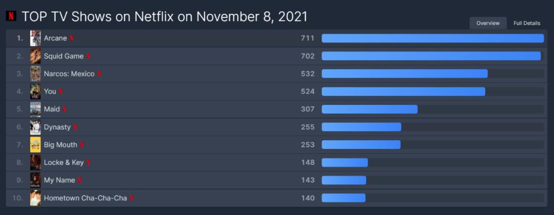 《双城之战》首日IMDB达9.2分,据统计网站FlixPatrol数据,该动画在11月8日播出前三集内容后,收视率瞬间飙升为Netflix全球收视率榜单第一名。