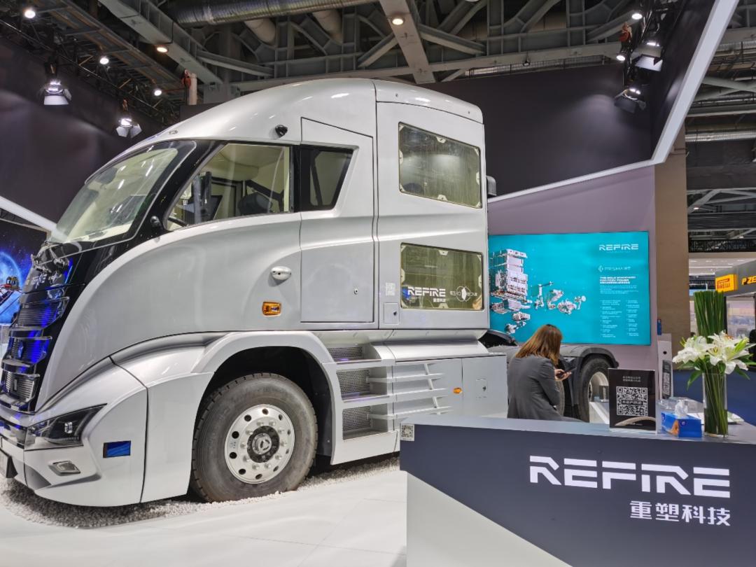 此次进博会上上海重塑科技带来了搭载镜星产品的49吨燃料电池智能重卡“星索一号”, 该车搭载了12瓶组70Mpa车载储氢系统,在实际运营中,只需加氢十多分钟,即可实现续航里程近1000公里。