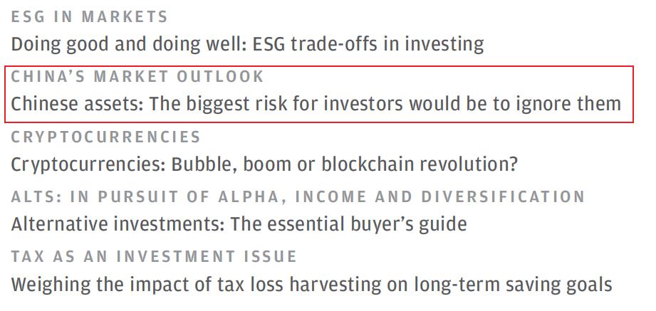 这份报告将中国资产单列为5大主题之一,与ESG投资、虚拟货币、另类资产、税收问题并列,并指出,最大的投资风险就是忽略中国资产的投资价值。